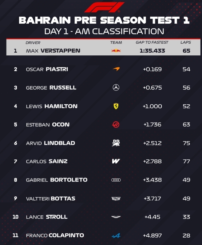 Макс Ферстаппен очолив ранкову сесію у перший день першого з двох триденних тестів у Бахрейні.