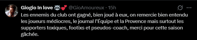 Giogio In love: Вороги клубу перемогли, молодці! Ми, звичайно, дякуємо посереднім гравцям, газеті L'Équipe та La Provence, але насамперед – токсичним уболівальникам, фанатам-непостійним уболівальникам та псевдотренерам. Дякую вам за цей витрачений даремно сезон.