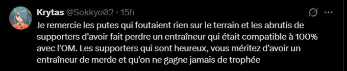 Krytas: Я дякую повіям, які нічого не зробили на полі, і тупим вболівальникам за те, що вони стали причиною відходу тренера, який ідеально підходив для «Марселя». А ті вболівальники, які задоволені, заслуговують на те, щоб у них був огидний тренер, і щоб ми ніколи не виграли жодного трофея.