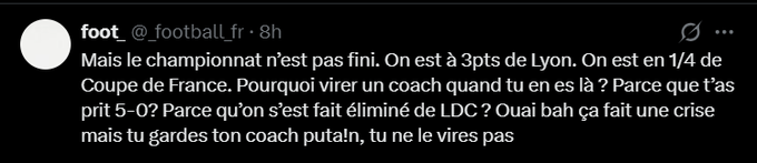 foot_: Але чемпіонат ще не закінчився. Ми відстаємо від Ліону на 3 очки. Ми у чвертьфіналі Кубка Франції. Навіщо звільняти тренера на цьому етапі? Бо програли 5:0? Бо вилетіли з Ліги чемпіонів? Так, звичайно, це викликає кризу, але тренера ж потрібно залишати, чорт забирай! Його не можна звільняти.