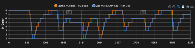 Порівняння телеметрії коробки передач Ферстаппена (2-й час дня) та Ландо Норріса (1-й час дня):