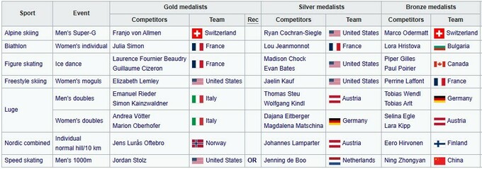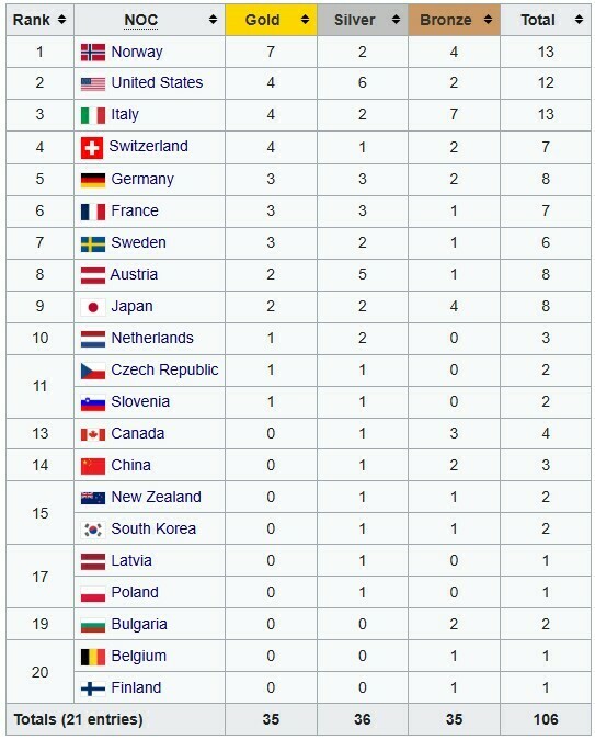 Лідирує у рейтингу команда Норвегії з 13 медалями, з яких уже 7 золотих, 2 срібні, 4 бронзові.