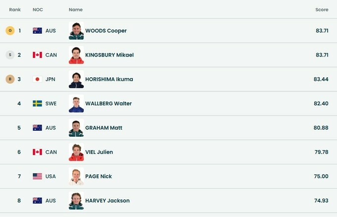 Два спортсмени отримали однакові бали. Золоту медаль здобув австралієць Купер Вудс, набравши 83.71 бали.
