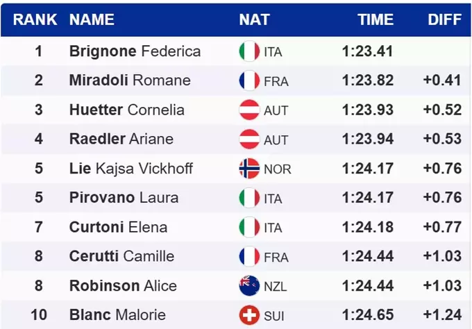 - 1. Федеріка Бріньоне (Італія) 1:23.41