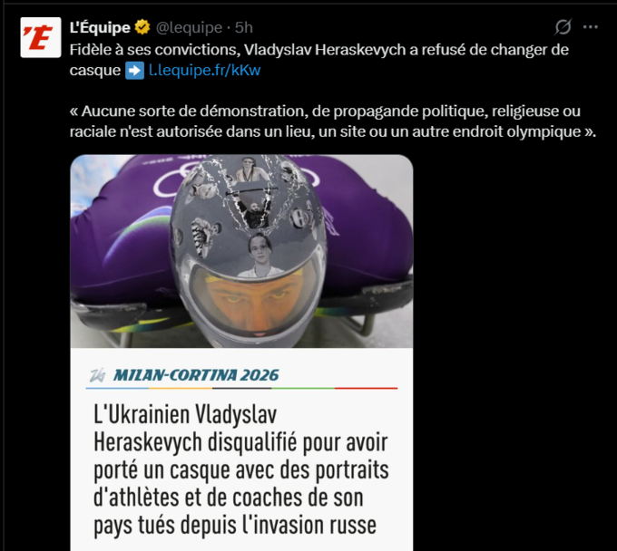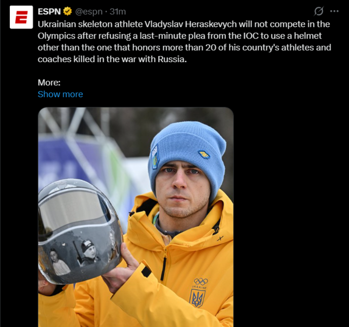 ESPN: Український скелетоніст Владислав Гераскевич не братиме участі в Олімпійських іграх, відмовившись від прохання МОК в останній момент використати шолом, відмінний від того, що носить ім'я понад 20 спортсменів та тренерів його країни, які загинули у війні з росією.