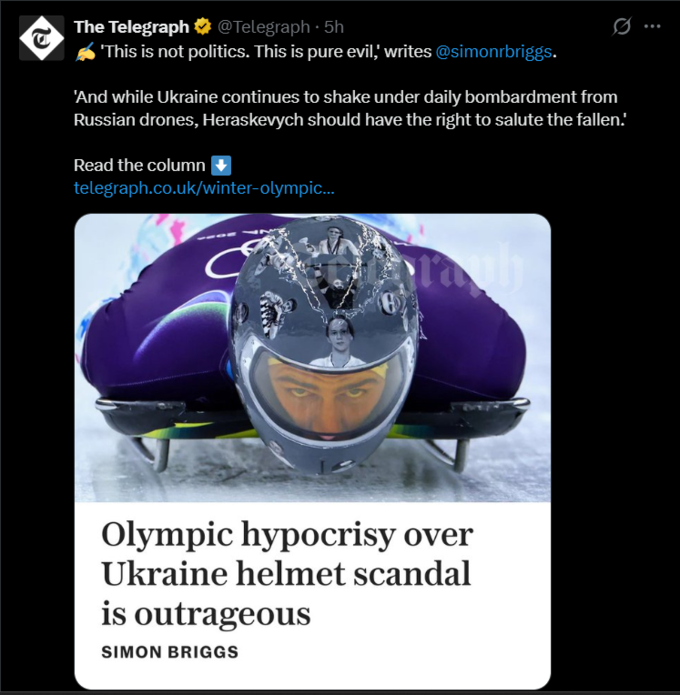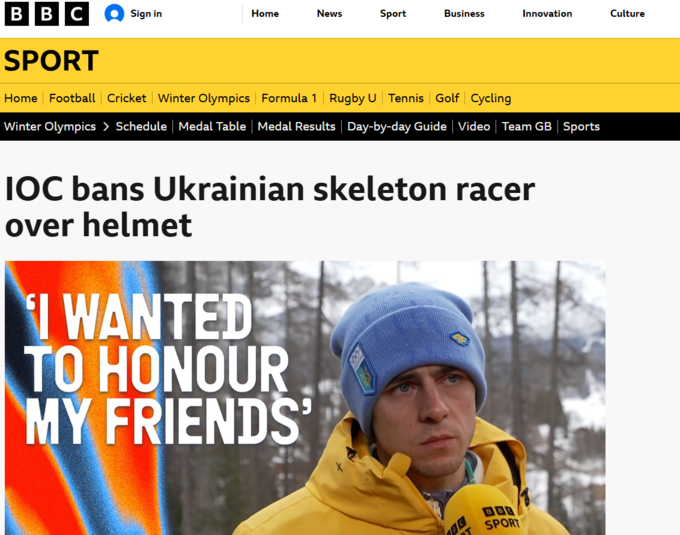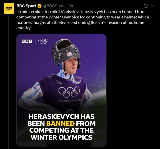 BBC Sport: Українського скелетоніста Владислава Гераскевича відсторонено від участі в зимових Олімпійських іграх за те, що продовжує носити шолом із зображеннями спортсменів, які загинули під час вторгнення росії до його країни.