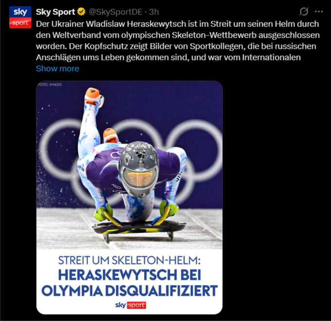 Sky Sport: Всесвітня федерація скелетону відсторонила українця Владислава Гераскевича від участі в олімпійських змаганнях зі скелетону через суперечку щодо його шолома. На головному уборі зображені його колеги-спортсмени, які загинули внаслідок терористичних атак з боку Росії, і який був заборонений Міжнародним олімпійським комітетом на зимових іграх.