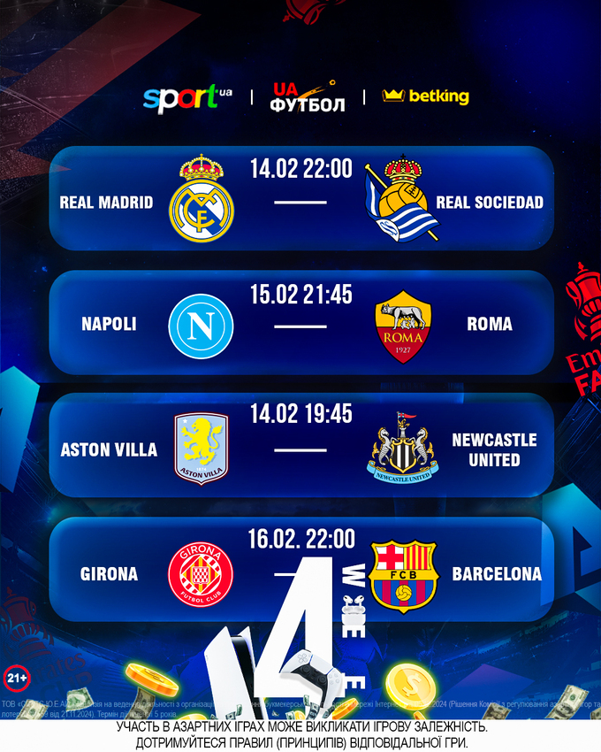 - Реал Мадрид – Реал Сосьєдад (14.02. 22:00)