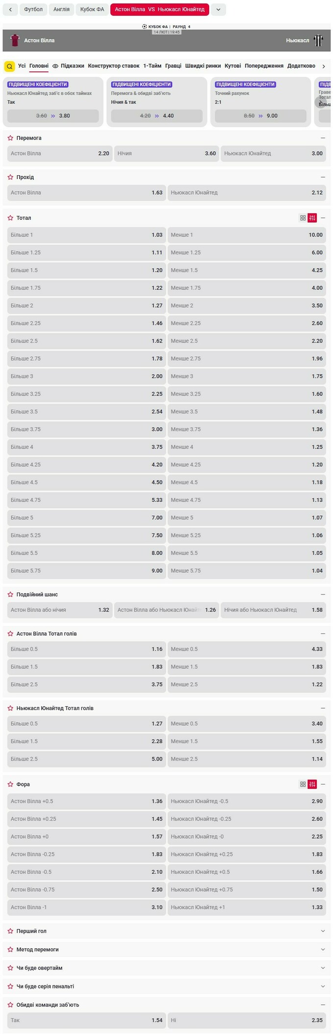 Лінія та коефіцієнти на матч Астон Вілла – Ньюкасл