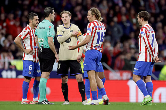 Капітан Барселони Френкі де Йонг розкритикував арбітра після гри проти Атлетіко у першому півфінальному матчі Кубка Іспанії, де каталонці розгромно поступилися (0:4).