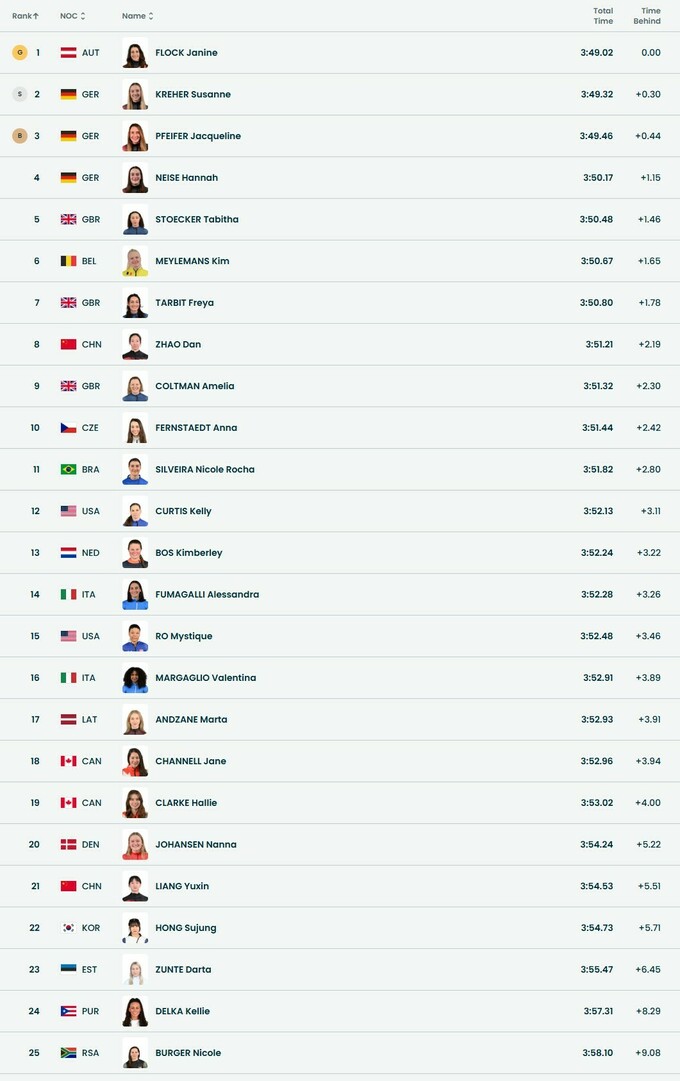 Флок продемонструвала стабільність у всіх чотирьох заїздах (сумарний час: 3:49.02) і втримала перевагу над два німецькими суперницями, які до останнього боролися за золото.