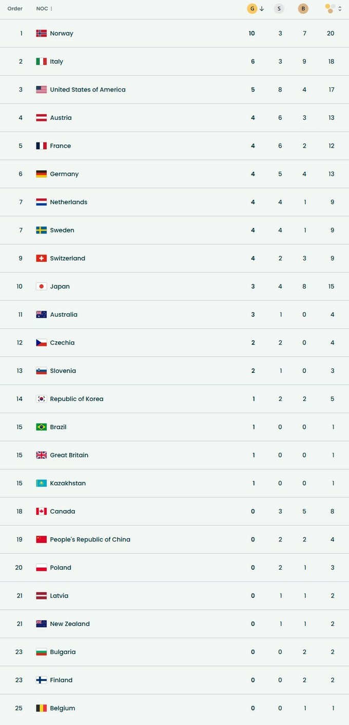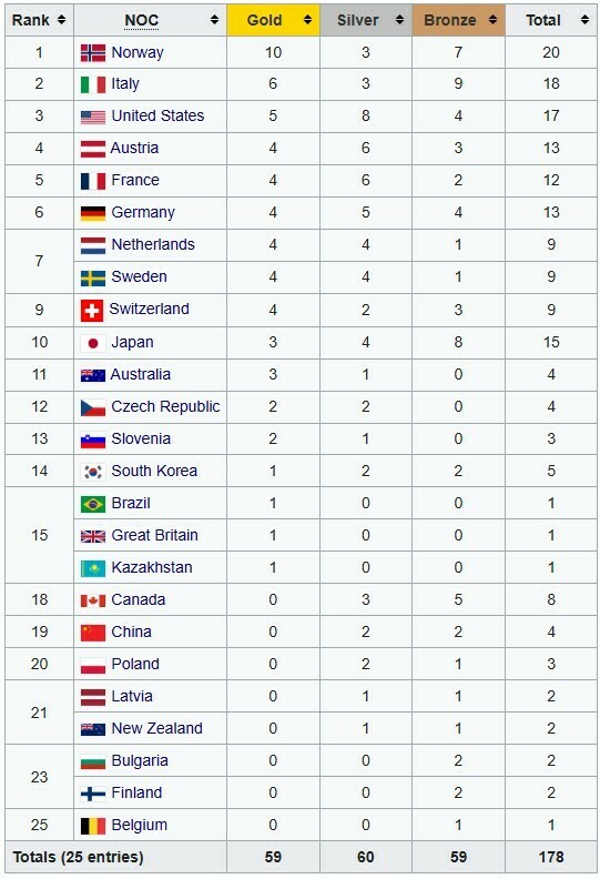 До топ-5 медальної таблиці також входять: Італія (6+3+9). США (5+8+4), Австрія (4+6+3), Франція (4+6+2).