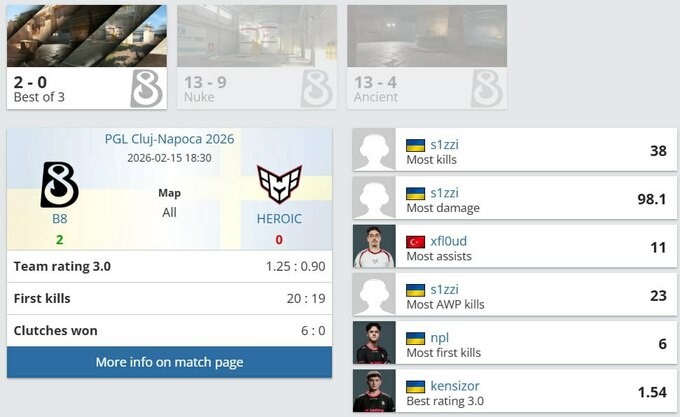 На Ancient сценарій повторився майже дзеркально. Уже в першій половині B8 знову захопили ініціативу, не дозволяючи супернику нав’язати свою гру. HEROIC змогли взяти лише чотири раунди наприкінці половини, але після зміни сторін ситуація не змінилася — українці продовжили контролювати темп і довели матч до впевненої перемоги.